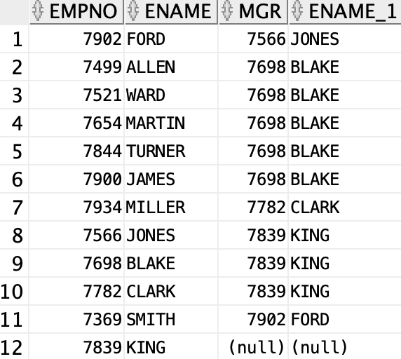 FROM emp a LEFT JOIN emp b ON a.mgr = b.empno;