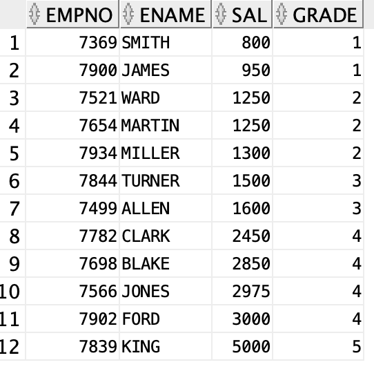 JOIN salgrade s ON e.sal BETWEEN losal AND hisal
