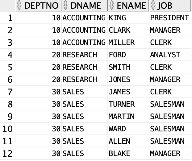 FROM dept d INNER JOIN emp e ON d.deptno = e.deptno; -- EQUI JOIN, INNER JOIN