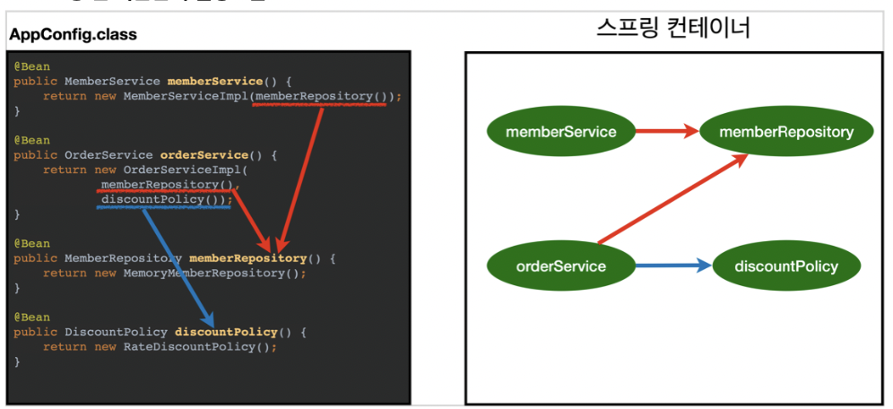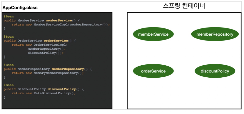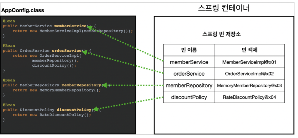 - ์ค์ ์ ๋ณด(AppConfig.class) ๋๊ฒจ์ฃผ๋ฉด ๊ทธ๊ฑธ ๋ณด๋ฉด์ @Bean ๋ถ์๊ฑฐ ํธ์ถํด์ ๋ฑ๋ก