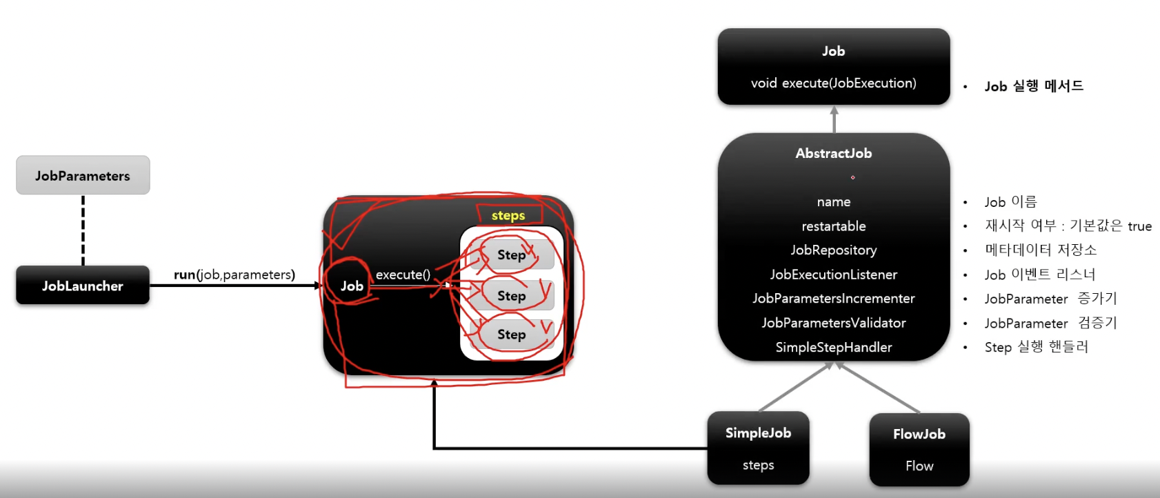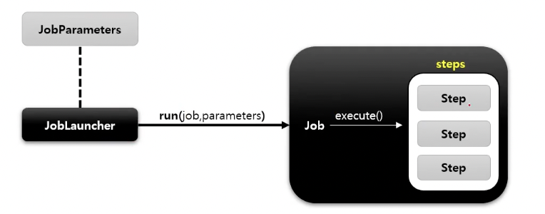 - JobLauncher (Job ์คํ) ์ด job ๊ฐ์ฒด์ parameters ๊ฐ์ฒด๋ก Job ์คํ