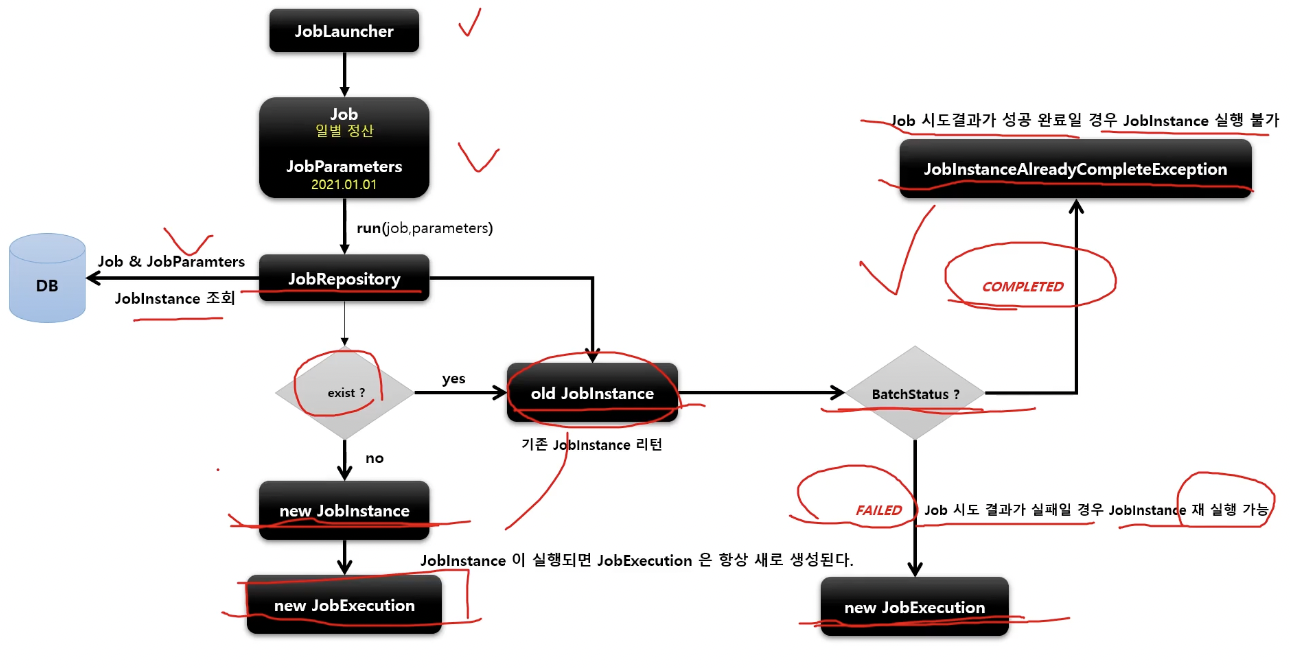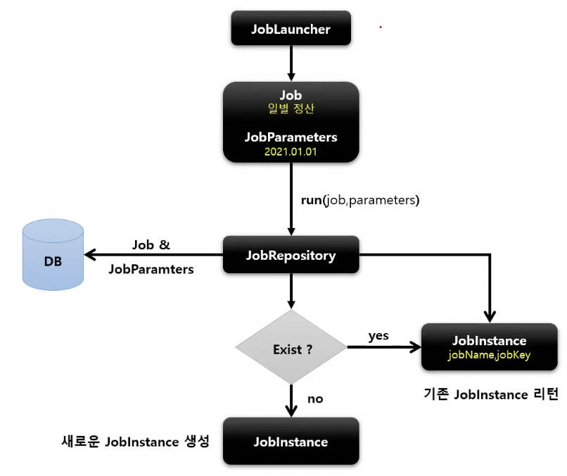 - Job / JobParameters ํค ๊ฐ์ผ๋ก ๊ธฐ์กด ์กด์ฌํ๋์ง ์ฌ๋ถ์ ๋ฐ๋ผ ์๋ก์ด JobInstance ์์ฑํ๊ฑฐ๋ ๊ธฐ์กด JobInstance ๋ฆฌํด