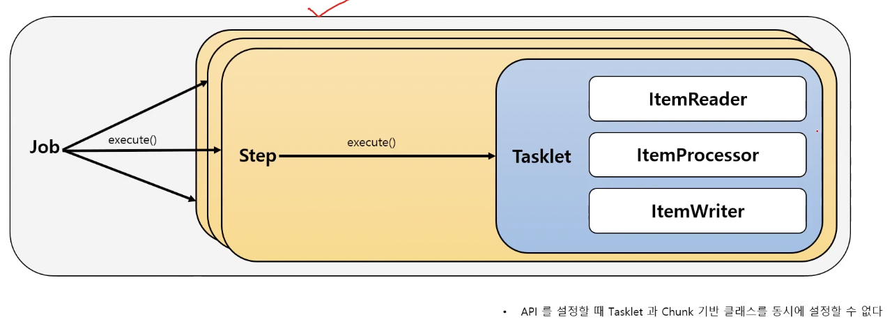 * Job ์ค์ -> Step ์ค์ -> Joblauncher๊ฐ Job ์คํ -> Job ๊ตฌ๋ -> Job์ด Step ์คํ -> Tasklet ์คํ